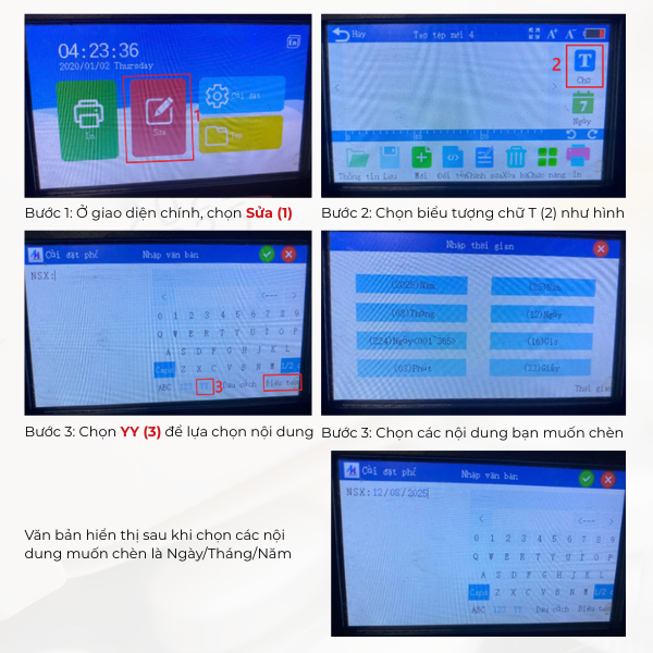 Soạn nội dung cần in, bao gồm ngày sản xuất và các ký tự đi kèm.